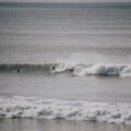 A beautiful sunset over the ocean with two people surfing (Freshwater Bay)