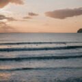 A beautiful sunset over the ocean with two people surfing (Freshwater Bay)