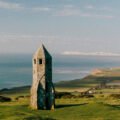A small tower is on a hill overlooking a body of water
