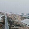 A person is cutting a large piece of meat on a blue plate with oranges and other food on the table