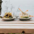 Two plates of food sit on a wooden table by the ocean