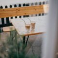 Two cups of coffee sit on a wooden table