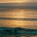 A surfer is in the ocean, with the sun setting in the background (Freshwater Bay)