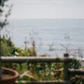 The sun is setting over the ocean, casting a warm glow on the water
