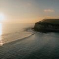 The sun is setting over the ocean, casting a warm glow on the water