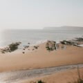 A beautiful sunset over the ocean with two people surfing (Freshwater Bay)